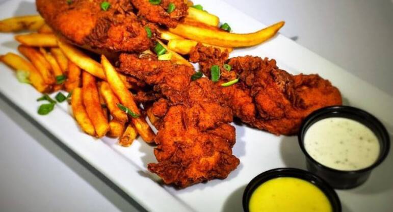 Beer battered pacific cod- house sauce- tartar- cocktail sauce. The open windows provide the freshest ocean breeze possible. Your choice of fries onion rings or tater tots.